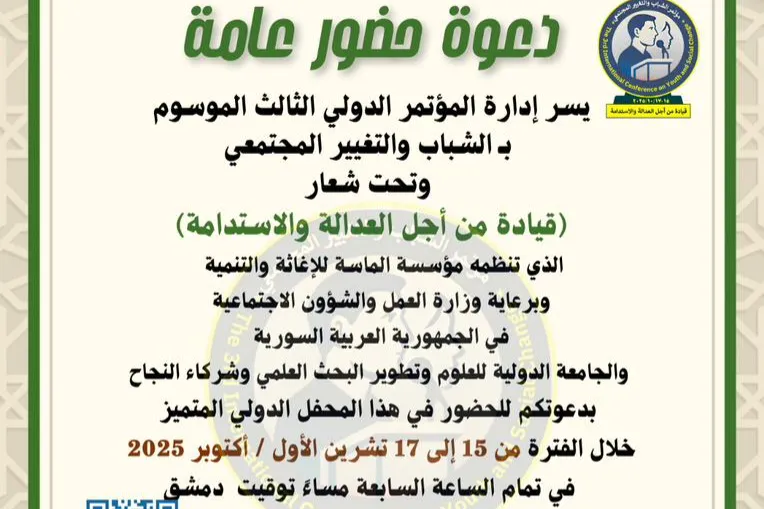 يسرّ مؤسسة الماسة للإغاثة والتنمية أن تعلن عن انطلاق أعمال المؤتمر الدولي الثالث للشباب والتغيير المجتمعي، وذلك يوم الأربعاء ١٥ /١٠ / ٢٠٢٥ بمشاركة نخبة من الباحثين والأكاديميين والمبادرات الشبابية من مختلف الدول